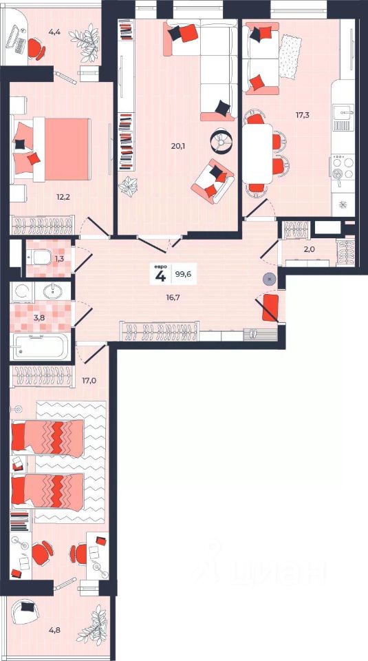 Продаётся 4-комнатная квартира в строящемся доме (Дом 30), срок сдачи: IV-кв. 2026, общей площадью 99.6 кв.м., на 10 этаже. Расположение, транспортная доступность Новый жилой комплекс "Юго-Восточный" строится в Туле, в 3,5 км от центра города. Благодаря удачным транспортным развязкам, автолюбители смогут доехать до центральных кварталов примерно за 5 10 минут, составив наиболее быстрый и удобный маршрут с учетом загруженности дорог. Проблем с мобильностью не возникнет и у пассажиров общественного транспорта. Рядом с домом расположены остановки автобусов и маршрутных такси, которые быстро довезут до любого района города. Так, чтобы добраться до центра, следует дойти пешком до остановки "Медтехника", где останавливается маршрутное такси, доезжающее до центральных кварталов всего за 7 8 минут. Инфраструктура Район, где возводится новый жилой комплекс, активно застраивается, и сеть инфраструктуры сов временем будет расширяться. Но и сейчас все, что нужно для комфортной жизни в городе, находится недалеко от жилого комплекса. В шаговой доступности расположены продуктовые магазины: "Виктория", "Овощи-фрукты", Магазин рыбы и мяса птицы, магазин мяса и колбас "У Максима", супермаркеты "Дикси", "Пятерочка", "SPAR". Неподалеку находится гипермаркет "Линия", крупный торговый центр, в котором расположены отделения банков, гипермаркет "Глобус", салон оптики, мебельный магазин "Столплит", зоомагазин "Четыре лапы" и пр. В соседнем здании находится строительный гипермаркет "Леруа Мерлен", за ним крупный магазин товаров для спорта, туризма и активного отдыха "Декатлон".Недалеко от жилого комплекса открыты кафе и рестораны: кофейня "Bonape", пиццерия "Культура", кафе "Вкуснов", кафе быстрого обслуживания "Rapido", ресторан "У фонтана" и пр.В районе есть аптеки, поликлиники, диагностические центры. В шаговой доступности от жилого комплекса расположено несколько детских садиков, в том числе, садик комбинированного вида "Алые паруса". Есть дошкольные отделения, входящие в состав образовательных центров, Центры развития ребенка. Поблизости расположены средние школы, в том числе, школа для детей с ОВЗ. Рядом с жилым комплексом находится Тульская Духовная Семинария и Суворовское училище. Надежность застройщик: достраивает объект ООО Ин-Групп.АрхитектураЖилой комплекс будет представлен 19 монолитно-кирпичными корпусами переменной этажности, выполненными в едином архитектурном стиле. При строительстве ЖК "Юго-Восточный" применяются современные материалы высокого качества, которые обеспечивают надежность домов и комфортный микроклимат в помещениях. Каждая секция оснащается современными лифтами. Помещения общего пользования отделываются экологичными материалами. Квартиры предлагаются однокомнатные (от 43,9 кв. м), двухкомнатные (от 45,8 кв. м), трехкомнатные (от 60,4 кв. м) и четырехкомнатные (от 87,2 кв. м), а также уютные студии (от 28,9 кв. м).На внутренней территории проводится комплексное благоустройство: озеленение, организация игровых площадок, мест для отдыха и за