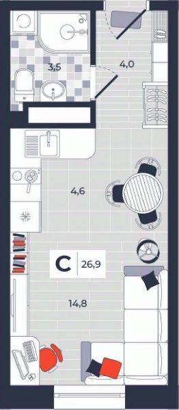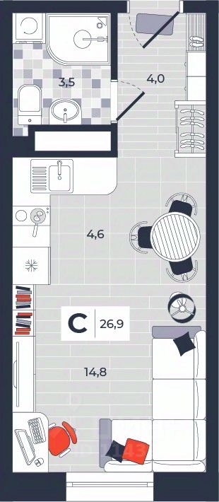 Продаётся студия в строящемся доме (Дом 30), срок сдачи: IV-кв. 2026, общей площадью 26.9 кв.м., на 12 этаже. Расположение, транспортная доступность Новый жилой комплекс "Юго-Восточный" строится в Туле, в 3,5 км от центра города. Благодаря удачным транспортным развязкам, автолюбители смогут доехать до центральных кварталов примерно за 5 10 минут, составив наиболее быстрый и удобный маршрут с учетом загруженности дорог. Проблем с мобильностью не возникнет и у пассажиров общественного транспорта. Рядом с домом расположены остановки автобусов и маршрутных такси, которые быстро довезут до любого района города. Так, чтобы добраться до центра, следует дойти пешком до остановки "Медтехника", где останавливается маршрутное такси, доезжающее до центральных кварталов всего за 7 8 минут. Инфраструктура Район, где возводится новый жилой комплекс, активно застраивается, и сеть инфраструктуры сов временем будет расширяться. Но и сейчас все, что нужно для комфортной жизни в городе, находится недалеко от жилого комплекса. В шаговой доступности расположены продуктовые магазины: "Виктория", "Овощи-фрукты", Магазин рыбы и мяса птицы, магазин мяса и колбас "У Максима", супермаркеты "Дикси", "Пятерочка", "SPAR". Неподалеку находится гипермаркет "Линия", крупный торговый центр, в котором расположены отделения банков, гипермаркет "Глобус", салон оптики, мебельный магазин "Столплит", зоомагазин "Четыре лапы" и пр. В соседнем здании находится строительный гипермаркет "Леруа Мерлен", за ним крупный магазин товаров для спорта, туризма и активного отдыха "Декатлон".Недалеко от жилого комплекса открыты кафе и рестораны: кофейня "Bonape", пиццерия "Культура", кафе "Вкуснов", кафе быстрого обслуживания "Rapido", ресторан "У фонтана" и пр.В районе есть аптеки, поликлиники, диагностические центры. В шаговой доступности от жилого комплекса расположено несколько детских садиков, в том числе, садик комбинированного вида "Алые паруса". Есть дошкольные отделения, входящие в состав образовательных центров, Центры развития ребенка. Поблизости расположены средние школы, в том числе, школа для детей с ОВЗ. Рядом с жилым комплексом находится Тульская Духовная Семинария и Суворовское училище. Надежность застройщик: достраивает объект ООО Ин-Групп.АрхитектураЖилой комплекс будет представлен 19 монолитно-кирпичными корпусами переменной этажности, выполненными в едином архитектурном стиле. При строительстве ЖК "Юго-Восточный" применяются современные материалы высокого качества, которые обеспечивают надежность домов и комфортный микроклимат в помещениях. Каждая секция оснащается современными лифтами. Помещения общего пользования отделываются экологичными материалами. Квартиры предлагаются однокомнатные (от 43,9 кв. м), двухкомнатные (от 45,8 кв. м), трехкомнатные (от 60,4 кв. м) и четырехкомнатные (от 87,2 кв. м), а также уютные студии (от 28,9 кв. м).На внутренней территории проводится комплексное благоустройство: озеленение, организация игровых площадок, мест для отдыха и занятий спортом,