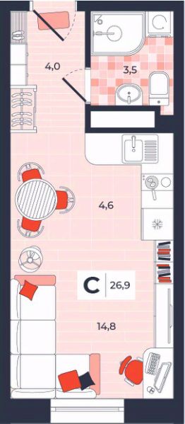 Продаётся студия в строящемся доме (Дом 30), срок сдачи: IV-кв. 2026, общей площадью 26.9 кв.м., на 12 этаже. Расположение, транспортная доступность Новый жилой комплекс "Юго-Восточный" строится в Туле, в 3,5 км от центра города. Благодаря удачным транспортным развязкам, автолюбители смогут доехать до центральных кварталов примерно за 5 10 минут, составив наиболее быстрый и удобный маршрут с учетом загруженности дорог. Проблем с мобильностью не возникнет и у пассажиров общественного транспорта. Рядом с домом расположены остановки автобусов и маршрутных такси, которые быстро довезут до любого района города. Так, чтобы добраться до центра, следует дойти пешком до остановки "Медтехника", где останавливается маршрутное такси, доезжающее до центральных кварталов всего за 7 8 минут. Инфраструктура Район, где возводится новый жилой комплекс, активно застраивается, и сеть инфраструктуры сов временем будет расширяться. Но и сейчас все, что нужно для комфортной жизни в городе, находится недалеко от жилого комплекса. В шаговой доступности расположены продуктовые магазины: "Виктория", "Овощи-фрукты", Магазин рыбы и мяса птицы, магазин мяса и колбас "У Максима", супермаркеты "Дикси", "Пятерочка", "SPAR". Неподалеку находится гипермаркет "Линия", крупный торговый центр, в котором расположены отделения банков, гипермаркет "Глобус", салон оптики, мебельный магазин "Столплит", зоомагазин "Четыре лапы" и пр. В соседнем здании находится строительный гипермаркет "Леруа Мерлен", за ним крупный магазин товаров для спорта, туризма и активного отдыха "Декатлон".Недалеко от жилого комплекса открыты кафе и рестораны: кофейня "Bonape", пиццерия "Культура", кафе "Вкуснов", кафе быстрого обслуживания "Rapido", ресторан "У фонтана" и пр.В районе есть аптеки, поликлиники, диагностические центры. В шаговой доступности от жилого комплекса расположено несколько детских садиков, в том числе, садик комбинированного вида "Алые паруса". Есть дошкольные отделения, входящие в состав образовательных центров, Центры развития ребенка. Поблизости расположены средние школы, в том числе, школа для детей с ОВЗ. Рядом с жилым комплексом находится Тульская Духовная Семинария и Суворовское училище. Надежность застройщик: достраивает объект ООО Ин-Групп.АрхитектураЖилой комплекс будет представлен 19 монолитно-кирпичными корпусами переменной этажности, выполненными в едином архитектурном стиле. При строительстве ЖК "Юго-Восточный" применяются современные материалы высокого качества, которые обеспечивают надежность домов и комфортный микроклимат в помещениях. Каждая секция оснащается современными лифтами. Помещения общего пользования отделываются экологичными материалами. Квартиры предлагаются однокомнатные (от 43,9 кв. м), двухкомнатные (от 45,8 кв. м), трехкомнатные (от 60,4 кв. м) и четырехкомнатные (от 87,2 кв. м), а также уютные студии (от 28,9 кв. м).На внутренней территории проводится комплексное благоустройство: озеленение, организация игровых площадок, мест для отдыха и занятий спортом,