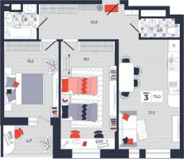 Продаётся 3-комнатная квартира в строящемся доме (Дом 30), срок сдачи: IV-кв. 2026, общей площадью 75 кв.м., на 14 этаже. Расположение, транспортная доступность Новый жилой комплекс "Юго-Восточный" строится в Туле, в 3,5 км от центра города. Благодаря удачным транспортным развязкам, автолюбители смогут доехать до центральных кварталов примерно за 5 10 минут, составив наиболее быстрый и удобный маршрут с учетом загруженности дорог. Проблем с мобильностью не возникнет и у пассажиров общественного транспорта. Рядом с домом расположены остановки автобусов и маршрутных такси, которые быстро довезут до любого района города. Так, чтобы добраться до центра, следует дойти пешком до остановки "Медтехника", где останавливается маршрутное такси, доезжающее до центральных кварталов всего за 7 8 минут. Инфраструктура Район, где возводится новый жилой комплекс, активно застраивается, и сеть инфраструктуры сов временем будет расширяться. Но и сейчас все, что нужно для комфортной жизни в городе, находится недалеко от жилого комплекса. В шаговой доступности расположены продуктовые магазины: "Виктория", "Овощи-фрукты", Магазин рыбы и мяса птицы, магазин мяса и колбас "У Максима", супермаркеты "Дикси", "Пятерочка", "SPAR". Неподалеку находится гипермаркет "Линия", крупный торговый центр, в котором расположены отделения банков, гипермаркет "Глобус", салон оптики, мебельный магазин "Столплит", зоомагазин "Четыре лапы" и пр. В соседнем здании находится строительный гипермаркет "Леруа Мерлен", за ним крупный магазин товаров для спорта, туризма и активного отдыха "Декатлон".Недалеко от жилого комплекса открыты кафе и рестораны: кофейня "Bonape", пиццерия "Культура", кафе "Вкуснов", кафе быстрого обслуживания "Rapido", ресторан "У фонтана" и пр.В районе есть аптеки, поликлиники, диагностические центры. В шаговой доступности от жилого комплекса расположено несколько детских садиков, в том числе, садик комбинированного вида "Алые паруса". Есть дошкольные отделения, входящие в состав образовательных центров, Центры развития ребенка. Поблизости расположены средние школы, в том числе, школа для детей с ОВЗ. Рядом с жилым комплексом находится Тульская Духовная Семинария и Суворовское училище. Надежность застройщик: достраивает объект ООО Ин-Групп.АрхитектураЖилой комплекс будет представлен 19 монолитно-кирпичными корпусами переменной этажности, выполненными в едином архитектурном стиле. При строительстве ЖК "Юго-Восточный" применяются современные материалы высокого качества, которые обеспечивают надежность домов и комфортный микроклимат в помещениях. Каждая секция оснащается современными лифтами. Помещения общего пользования отделываются экологичными материалами. Квартиры предлагаются однокомнатные (от 43,9 кв. м), двухкомнатные (от 45,8 кв. м), трехкомнатные (от 60,4 кв. м) и четырехкомнатные (от 87,2 кв. м), а также уютные студии (от 28,9 кв. м).На внутренней территории проводится комплексное благоустройство: озеленение, организация игровых площадок, мест для отдыха и заня