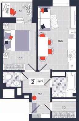 Продаётся 2-комнатная квартира в строящемся доме (Дом 30), срок сдачи: IV-кв. 2026, общей площадью 46.3 кв.м., на 8 этаже. Расположение, транспортная доступность Новый жилой комплекс "Юго-Восточный" строится в Туле, в 3,5 км от центра города. Благодаря удачным транспортным развязкам, автолюбители смогут доехать до центральных кварталов примерно за 5 10 минут, составив наиболее быстрый и удобный маршрут с учетом загруженности дорог. Проблем с мобильностью не возникнет и у пассажиров общественного транспорта. Рядом с домом расположены остановки автобусов и маршрутных такси, которые быстро довезут до любого района города. Так, чтобы добраться до центра, следует дойти пешком до остановки "Медтехника", где останавливается маршрутное такси, доезжающее до центральных кварталов всего за 7 8 минут. Инфраструктура Район, где возводится новый жилой комплекс, активно застраивается, и сеть инфраструктуры сов временем будет расширяться. Но и сейчас все, что нужно для комфортной жизни в городе, находится недалеко от жилого комплекса. В шаговой доступности расположены продуктовые магазины: "Виктория", "Овощи-фрукты", Магазин рыбы и мяса птицы, магазин мяса и колбас "У Максима", супермаркеты "Дикси", "Пятерочка", "SPAR". Неподалеку находится гипермаркет "Линия", крупный торговый центр, в котором расположены отделения банков, гипермаркет "Глобус", салон оптики, мебельный магазин "Столплит", зоомагазин "Четыре лапы" и пр. В соседнем здании находится строительный гипермаркет "Леруа Мерлен", за ним крупный магазин товаров для спорта, туризма и активного отдыха "Декатлон".Недалеко от жилого комплекса открыты кафе и рестораны: кофейня "Bonape", пиццерия "Культура", кафе "Вкуснов", кафе быстрого обслуживания "Rapido", ресторан "У фонтана" и пр.В районе есть аптеки, поликлиники, диагностические центры. В шаговой доступности от жилого комплекса расположено несколько детских садиков, в том числе, садик комбинированного вида "Алые паруса". Есть дошкольные отделения, входящие в состав образовательных центров, Центры развития ребенка. Поблизости расположены средние школы, в том числе, школа для детей с ОВЗ. Рядом с жилым комплексом находится Тульская Духовная Семинария и Суворовское училище. Надежность застройщик: достраивает объект ООО Ин-Групп.АрхитектураЖилой комплекс будет представлен 19 монолитно-кирпичными корпусами переменной этажности, выполненными в едином архитектурном стиле. При строительстве ЖК "Юго-Восточный" применяются современные материалы высокого качества, которые обеспечивают надежность домов и комфортный микроклимат в помещениях. Каждая секция оснащается современными лифтами. Помещения общего пользования отделываются экологичными материалами. Квартиры предлагаются однокомнатные (от 43,9 кв. м), двухкомнатные (от 45,8 кв. м), трехкомнатные (от 60,4 кв. м) и четырехкомнатные (от 87,2 кв. м), а также уютные студии (от 28,9 кв. м).На внутренней территории проводится комплексное благоустройство: озеленение, организация игровых площадок, мест для отдыха и зан