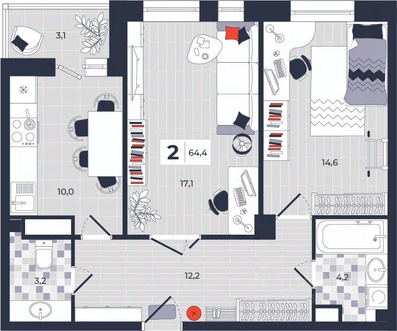 Продаётся 2-комнатная квартира в строящемся доме (Дом 30), срок сдачи: IV-кв. 2026, общей площадью 64.4 кв.м., на 10 этаже. Расположение, транспортная доступность Новый жилой комплекс "Юго-Восточный" строится в Туле, в 3,5 км от центра города. Благодаря удачным транспортным развязкам, автолюбители смогут доехать до центральных кварталов примерно за 5 10 минут, составив наиболее быстрый и удобный маршрут с учетом загруженности дорог. Проблем с мобильностью не возникнет и у пассажиров общественного транспорта. Рядом с домом расположены остановки автобусов и маршрутных такси, которые быстро довезут до любого района города. Так, чтобы добраться до центра, следует дойти пешком до остановки "Медтехника", где останавливается маршрутное такси, доезжающее до центральных кварталов всего за 7 8 минут. Инфраструктура Район, где возводится новый жилой комплекс, активно застраивается, и сеть инфраструктуры сов временем будет расширяться. Но и сейчас все, что нужно для комфортной жизни в городе, находится недалеко от жилого комплекса. В шаговой доступности расположены продуктовые магазины: "Виктория", "Овощи-фрукты", Магазин рыбы и мяса птицы, магазин мяса и колбас "У Максима", супермаркеты "Дикси", "Пятерочка", "SPAR". Неподалеку находится гипермаркет "Линия", крупный торговый центр, в котором расположены отделения банков, гипермаркет "Глобус", салон оптики, мебельный магазин "Столплит", зоомагазин "Четыре лапы" и пр. В соседнем здании находится строительный гипермаркет "Леруа Мерлен", за ним крупный магазин товаров для спорта, туризма и активного отдыха "Декатлон".Недалеко от жилого комплекса открыты кафе и рестораны: кофейня "Bonape", пиццерия "Культура", кафе "Вкуснов", кафе быстрого обслуживания "Rapido", ресторан "У фонтана" и пр.В районе есть аптеки, поликлиники, диагностические центры. В шаговой доступности от жилого комплекса расположено несколько детских садиков, в том числе, садик комбинированного вида "Алые паруса". Есть дошкольные отделения, входящие в состав образовательных центров, Центры развития ребенка. Поблизости расположены средние школы, в том числе, школа для детей с ОВЗ. Рядом с жилым комплексом находится Тульская Духовная Семинария и Суворовское училище. Надежность застройщик: достраивает объект ООО Ин-Групп.АрхитектураЖилой комплекс будет представлен 19 монолитно-кирпичными корпусами переменной этажности, выполненными в едином архитектурном стиле. При строительстве ЖК "Юго-Восточный" применяются современные материалы высокого качества, которые обеспечивают надежность домов и комфортный микроклимат в помещениях. Каждая секция оснащается современными лифтами. Помещения общего пользования отделываются экологичными материалами. Квартиры предлагаются однокомнатные (от 43,9 кв. м), двухкомнатные (от 45,8 кв. м), трехкомнатные (от 60,4 кв. м) и четырехкомнатные (от 87,2 кв. м), а также уютные студии (от 28,9 кв. м).На внутренней территории проводится комплексное благоустройство: озеленение, организация игровых площадок, мест для отдыха и за