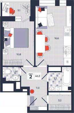 Продаётся 2-комнатная квартира в строящемся доме (Дом 30), срок сдачи: IV-кв. 2026, общей площадью 46.3 кв.м., на 3 этаже. Расположение, транспортная доступность Новый жилой комплекс "Юго-Восточный" строится в Туле, в 3,5 км от центра города. Благодаря удачным транспортным развязкам, автолюбители смогут доехать до центральных кварталов примерно за 5 10 минут, составив наиболее быстрый и удобный маршрут с учетом загруженности дорог. Проблем с мобильностью не возникнет и у пассажиров общественного транспорта. Рядом с домом расположены остановки автобусов и маршрутных такси, которые быстро довезут до любого района города. Так, чтобы добраться до центра, следует дойти пешком до остановки "Медтехника", где останавливается маршрутное такси, доезжающее до центральных кварталов всего за 7 8 минут. Инфраструктура Район, где возводится новый жилой комплекс, активно застраивается, и сеть инфраструктуры сов временем будет расширяться. Но и сейчас все, что нужно для комфортной жизни в городе, находится недалеко от жилого комплекса. В шаговой доступности расположены продуктовые магазины: "Виктория", "Овощи-фрукты", Магазин рыбы и мяса птицы, магазин мяса и колбас "У Максима", супермаркеты "Дикси", "Пятерочка", "SPAR". Неподалеку находится гипермаркет "Линия", крупный торговый центр, в котором расположены отделения банков, гипермаркет "Глобус", салон оптики, мебельный магазин "Столплит", зоомагазин "Четыре лапы" и пр. В соседнем здании находится строительный гипермаркет "Леруа Мерлен", за ним крупный магазин товаров для спорта, туризма и активного отдыха "Декатлон".Недалеко от жилого комплекса открыты кафе и рестораны: кофейня "Bonape", пиццерия "Культура", кафе "Вкуснов", кафе быстрого обслуживания "Rapido", ресторан "У фонтана" и пр.В районе есть аптеки, поликлиники, диагностические центры. В шаговой доступности от жилого комплекса расположено несколько детских садиков, в том числе, садик комбинированного вида "Алые паруса". Есть дошкольные отделения, входящие в состав образовательных центров, Центры развития ребенка. Поблизости расположены средние школы, в том числе, школа для детей с ОВЗ. Рядом с жилым комплексом находится Тульская Духовная Семинария и Суворовское училище. Надежность застройщик: достраивает объект ООО Ин-Групп.АрхитектураЖилой комплекс будет представлен 19 монолитно-кирпичными корпусами переменной этажности, выполненными в едином архитектурном стиле. При строительстве ЖК "Юго-Восточный" применяются современные материалы высокого качества, которые обеспечивают надежность домов и комфортный микроклимат в помещениях. Каждая секция оснащается современными лифтами. Помещения общего пользования отделываются экологичными материалами. Квартиры предлагаются однокомнатные (от 43,9 кв. м), двухкомнатные (от 45,8 кв. м), трехкомнатные (от 60,4 кв. м) и четырехкомнатные (от 87,2 кв. м), а также уютные студии (от 28,9 кв. м).На внутренней территории проводится комплексное благоустройство: озеленение, организация игровых площадок, мест для отдыха и зан
