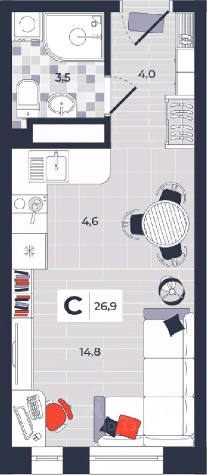 Продаётся студия в строящемся доме (Дом 30), срок сдачи: IV-кв. 2026, общей площадью 26.9 кв.м., на 7 этаже. Расположение, транспортная доступность Новый жилой комплекс "Юго-Восточный" строится в Туле, в 3,5 км от центра города. Благодаря удачным транспортным развязкам, автолюбители смогут доехать до центральных кварталов примерно за 5 10 минут, составив наиболее быстрый и удобный маршрут с учетом загруженности дорог. Проблем с мобильностью не возникнет и у пассажиров общественного транспорта. Рядом с домом расположены остановки автобусов и маршрутных такси, которые быстро довезут до любого района города. Так, чтобы добраться до центра, следует дойти пешком до остановки "Медтехника", где останавливается маршрутное такси, доезжающее до центральных кварталов всего за 7 8 минут. Инфраструктура Район, где возводится новый жилой комплекс, активно застраивается, и сеть инфраструктуры сов временем будет расширяться. Но и сейчас все, что нужно для комфортной жизни в городе, находится недалеко от жилого комплекса. В шаговой доступности расположены продуктовые магазины: "Виктория", "Овощи-фрукты", Магазин рыбы и мяса птицы, магазин мяса и колбас "У Максима", супермаркеты "Дикси", "Пятерочка", "SPAR". Неподалеку находится гипермаркет "Линия", крупный торговый центр, в котором расположены отделения банков, гипермаркет "Глобус", салон оптики, мебельный магазин "Столплит", зоомагазин "Четыре лапы" и пр. В соседнем здании находится строительный гипермаркет "Леруа Мерлен", за ним крупный магазин товаров для спорта, туризма и активного отдыха "Декатлон".Недалеко от жилого комплекса открыты кафе и рестораны: кофейня "Bonape", пиццерия "Культура", кафе "Вкуснов", кафе быстрого обслуживания "Rapido", ресторан "У фонтана" и пр.В районе есть аптеки, поликлиники, диагностические центры. В шаговой доступности от жилого комплекса расположено несколько детских садиков, в том числе, садик комбинированного вида "Алые паруса". Есть дошкольные отделения, входящие в состав образовательных центров, Центры развития ребенка. Поблизости расположены средние школы, в том числе, школа для детей с ОВЗ. Рядом с жилым комплексом находится Тульская Духовная Семинария и Суворовское училище. Надежность застройщик: достраивает объект ООО Ин-Групп.АрхитектураЖилой комплекс будет представлен 19 монолитно-кирпичными корпусами переменной этажности, выполненными в едином архитектурном стиле. При строительстве ЖК "Юго-Восточный" применяются современные материалы высокого качества, которые обеспечивают надежность домов и комфортный микроклимат в помещениях. Каждая секция оснащается современными лифтами. Помещения общего пользования отделываются экологичными материалами. Квартиры предлагаются однокомнатные (от 43,9 кв. м), двухкомнатные (от 45,8 кв. м), трехкомнатные (от 60,4 кв. м) и четырехкомнатные (от 87,2 кв. м), а также уютные студии (от 28,9 кв. м).На внутренней территории проводится комплексное благоустройство: озеленение, организация игровых площадок, мест для отдыха и занятий спортом,