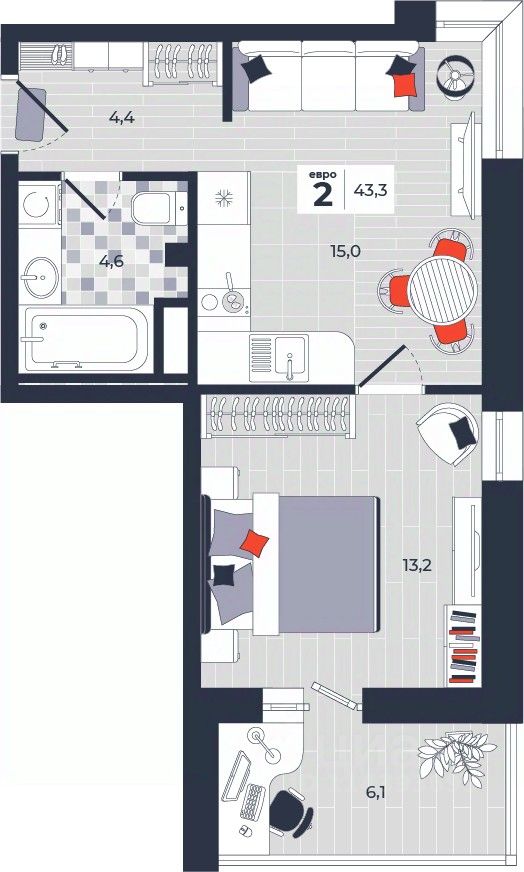 Продаётся 2-комнатная квартира в строящемся доме (Дом 30), срок сдачи: IV-кв. 2026, общей площадью 43.3 кв.м., на 4 этаже. Расположение, транспортная доступность Новый жилой комплекс "Юго-Восточный" строится в Туле, в 3,5 км от центра города. Благодаря удачным транспортным развязкам, автолюбители смогут доехать до центральных кварталов примерно за 5 10 минут, составив наиболее быстрый и удобный маршрут с учетом загруженности дорог. Проблем с мобильностью не возникнет и у пассажиров общественного транспорта. Рядом с домом расположены остановки автобусов и маршрутных такси, которые быстро довезут до любого района города. Так, чтобы добраться до центра, следует дойти пешком до остановки "Медтехника", где останавливается маршрутное такси, доезжающее до центральных кварталов всего за 7 8 минут. Инфраструктура Район, где возводится новый жилой комплекс, активно застраивается, и сеть инфраструктуры сов временем будет расширяться. Но и сейчас все, что нужно для комфортной жизни в городе, находится недалеко от жилого комплекса. В шаговой доступности расположены продуктовые магазины: "Виктория", "Овощи-фрукты", Магазин рыбы и мяса птицы, магазин мяса и колбас "У Максима", супермаркеты "Дикси", "Пятерочка", "SPAR". Неподалеку находится гипермаркет "Линия", крупный торговый центр, в котором расположены отделения банков, гипермаркет "Глобус", салон оптики, мебельный магазин "Столплит", зоомагазин "Четыре лапы" и пр. В соседнем здании находится строительный гипермаркет "Леруа Мерлен", за ним крупный магазин товаров для спорта, туризма и активного отдыха "Декатлон".Недалеко от жилого комплекса открыты кафе и рестораны: кофейня "Bonape", пиццерия "Культура", кафе "Вкуснов", кафе быстрого обслуживания "Rapido", ресторан "У фонтана" и пр.В районе есть аптеки, поликлиники, диагностические центры. В шаговой доступности от жилого комплекса расположено несколько детских садиков, в том числе, садик комбинированного вида "Алые паруса". Есть дошкольные отделения, входящие в состав образовательных центров, Центры развития ребенка. Поблизости расположены средние школы, в том числе, школа для детей с ОВЗ. Рядом с жилым комплексом находится Тульская Духовная Семинария и Суворовское училище. Надежность застройщик: достраивает объект ООО Ин-Групп.АрхитектураЖилой комплекс будет представлен 19 монолитно-кирпичными корпусами переменной этажности, выполненными в едином архитектурном стиле. При строительстве ЖК "Юго-Восточный" применяются современные материалы высокого качества, которые обеспечивают надежность домов и комфортный микроклимат в помещениях. Каждая секция оснащается современными лифтами. Помещения общего пользования отделываются экологичными материалами. Квартиры предлагаются однокомнатные (от 43,9 кв. м), двухкомнатные (от 45,8 кв. м), трехкомнатные (от 60,4 кв. м) и четырехкомнатные (от 87,2 кв. м), а также уютные студии (от 28,9 кв. м).На внутренней территории проводится комплексное благоустройство: озеленение, организация игровых площадок, мест для отдыха и зан