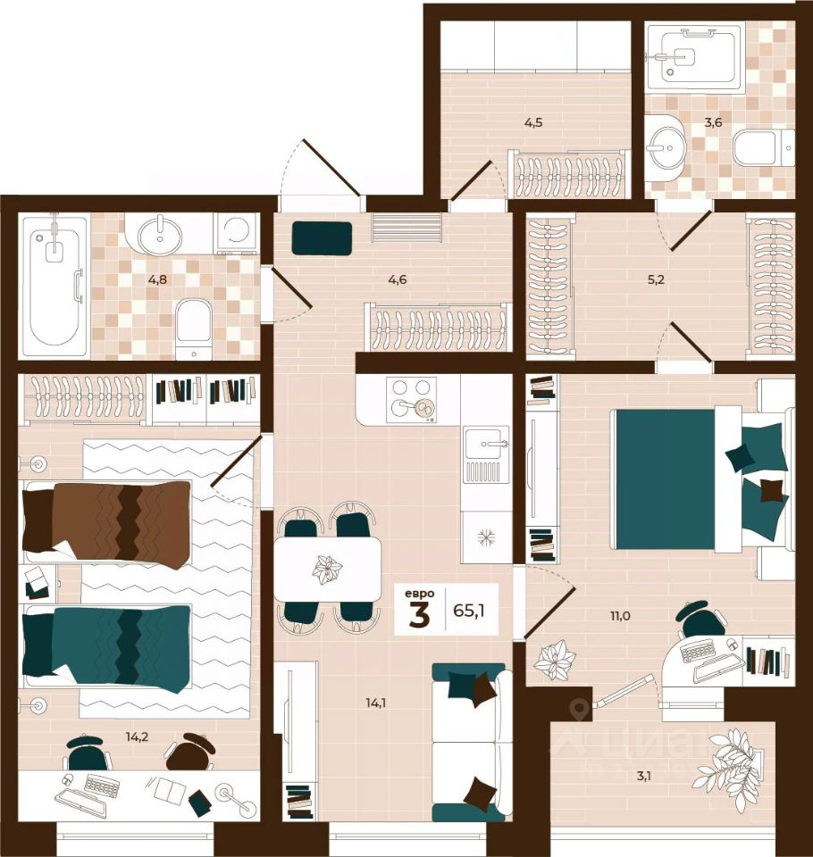 Продаётся 3-комнатная квартира в строящемся доме (Дом 28), срок сдачи: I-кв. 2027, общей площадью 65.1 кв.м., на 12 этаже. Расположение, транспортная доступность Новый жилой комплекс "Юго-Восточный" строится в Туле, в 3,5 км от центра города. Благодаря удачным транспортным развязкам, автолюбители смогут доехать до центральных кварталов примерно за 5 10 минут, составив наиболее быстрый и удобный маршрут с учетом загруженности дорог. Проблем с мобильностью не возникнет и у пассажиров общественного транспорта. Рядом с домом расположены остановки автобусов и маршрутных такси, которые быстро довезут до любого района города. Так, чтобы добраться до центра, следует дойти пешком до остановки "Медтехника", где останавливается маршрутное такси, доезжающее до центральных кварталов всего за 7 8 минут. Инфраструктура Район, где возводится новый жилой комплекс, активно застраивается, и сеть инфраструктуры сов временем будет расширяться. Но и сейчас все, что нужно для комфортной жизни в городе, находится недалеко от жилого комплекса. В шаговой доступности расположены продуктовые магазины: "Виктория", "Овощи-фрукты", Магазин рыбы и мяса птицы, магазин мяса и колбас "У Максима", супермаркеты "Дикси", "Пятерочка", "SPAR". Неподалеку находится гипермаркет "Линия", крупный торговый центр, в котором расположены отделения банков, гипермаркет "Глобус", салон оптики, мебельный магазин "Столплит", зоомагазин "Четыре лапы" и пр. В соседнем здании находится строительный гипермаркет "Леруа Мерлен", за ним крупный магазин товаров для спорта, туризма и активного отдыха "Декатлон".Недалеко от жилого комплекса открыты кафе и рестораны: кофейня "Bonape", пиццерия "Культура", кафе "Вкуснов", кафе быстрого обслуживания "Rapido", ресторан "У фонтана" и пр.В районе есть аптеки, поликлиники, диагностические центры. В шаговой доступности от жилого комплекса расположено несколько детских садиков, в том числе, садик комбинированного вида "Алые паруса". Есть дошкольные отделения, входящие в состав образовательных центров, Центры развития ребенка. Поблизости расположены средние школы, в том числе, школа для детей с ОВЗ. Рядом с жилым комплексом находится Тульская Духовная Семинария и Суворовское училище. Надежность застройщик: достраивает объект ООО Ин-Групп.АрхитектураЖилой комплекс будет представлен 19 монолитно-кирпичными корпусами переменной этажности, выполненными в едином архитектурном стиле. При строительстве ЖК "Юго-Восточный" применяются современные материалы высокого качества, которые обеспечивают надежность домов и комфортный микроклимат в помещениях. Каждая секция оснащается современными лифтами. Помещения общего пользования отделываются экологичными материалами. Квартиры предлагаются однокомнатные (от 43,9 кв. м), двухкомнатные (от 45,8 кв. м), трехкомнатные (от 60,4 кв. м) и четырехкомнатные (от 87,2 кв. м), а также уютные студии (от 28,9 кв. м).На внутренней территории проводится комплексное благоустройство: озеленение, организация игровых площадок, мест для отдыха и зан