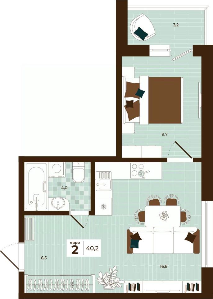 Продаётся 2-комнатная квартира в строящемся доме (Дом 28), срок сдачи: I-кв. 2027, общей площадью 40.2 кв.м., на 3 этаже. Расположение, транспортная доступность Новый жилой комплекс "Юго-Восточный" строится в Туле, в 3,5 км от центра города. Благодаря удачным транспортным развязкам, автолюбители смогут доехать до центральных кварталов примерно за 5 10 минут, составив наиболее быстрый и удобный маршрут с учетом загруженности дорог. Проблем с мобильностью не возникнет и у пассажиров общественного транспорта. Рядом с домом расположены остановки автобусов и маршрутных такси, которые быстро довезут до любого района города. Так, чтобы добраться до центра, следует дойти пешком до остановки "Медтехника", где останавливается маршрутное такси, доезжающее до центральных кварталов всего за 7 8 минут. Инфраструктура Район, где возводится новый жилой комплекс, активно застраивается, и сеть инфраструктуры сов временем будет расширяться. Но и сейчас все, что нужно для комфортной жизни в городе, находится недалеко от жилого комплекса. В шаговой доступности расположены продуктовые магазины: "Виктория", "Овощи-фрукты", Магазин рыбы и мяса птицы, магазин мяса и колбас "У Максима", супермаркеты "Дикси", "Пятерочка", "SPAR". Неподалеку находится гипермаркет "Линия", крупный торговый центр, в котором расположены отделения банков, гипермаркет "Глобус", салон оптики, мебельный магазин "Столплит", зоомагазин "Четыре лапы" и пр. В соседнем здании находится строительный гипермаркет "Леруа Мерлен", за ним крупный магазин товаров для спорта, туризма и активного отдыха "Декатлон".Недалеко от жилого комплекса открыты кафе и рестораны: кофейня "Bonape", пиццерия "Культура", кафе "Вкуснов", кафе быстрого обслуживания "Rapido", ресторан "У фонтана" и пр.В районе есть аптеки, поликлиники, диагностические центры. В шаговой доступности от жилого комплекса расположено несколько детских садиков, в том числе, садик комбинированного вида "Алые паруса". Есть дошкольные отделения, входящие в состав образовательных центров, Центры развития ребенка. Поблизости расположены средние школы, в том числе, школа для детей с ОВЗ. Рядом с жилым комплексом находится Тульская Духовная Семинария и Суворовское училище. Надежность застройщик: достраивает объект ООО Ин-Групп.АрхитектураЖилой комплекс будет представлен 19 монолитно-кирпичными корпусами переменной этажности, выполненными в едином архитектурном стиле. При строительстве ЖК "Юго-Восточный" применяются современные материалы высокого качества, которые обеспечивают надежность домов и комфортный микроклимат в помещениях. Каждая секция оснащается современными лифтами. Помещения общего пользования отделываются экологичными материалами. Квартиры предлагаются однокомнатные (от 43,9 кв. м), двухкомнатные (от 45,8 кв. м), трехкомнатные (от 60,4 кв. м) и четырехкомнатные (от 87,2 кв. м), а также уютные студии (от 28,9 кв. м).На внутренней территории проводится комплексное благоустройство: озеленение, организация игровых площадок, мест для отдыха и заня