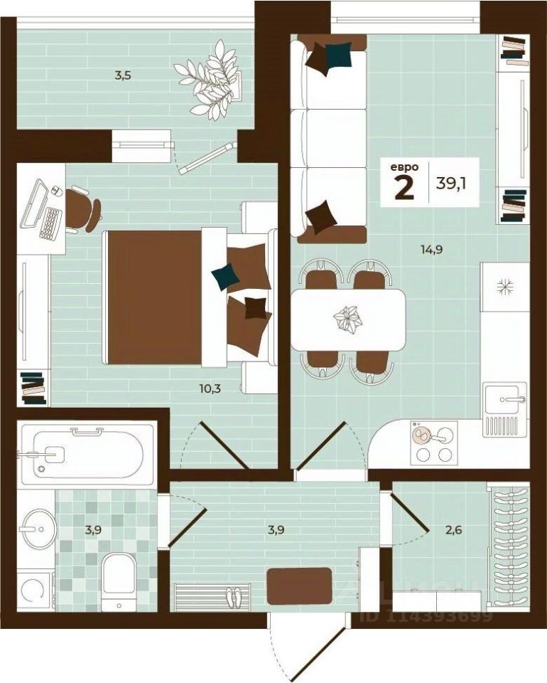 Продаётся 2-комнатная квартира в строящемся доме (Дом 28), срок сдачи: I-кв. 2027, общей площадью 39.1 кв.м., на 2 этаже. Расположение, транспортная доступность Новый жилой комплекс "Юго-Восточный" строится в Туле, в 3,5 км от центра города. Благодаря удачным транспортным развязкам, автолюбители смогут доехать до центральных кварталов примерно за 5 10 минут, составив наиболее быстрый и удобный маршрут с учетом загруженности дорог. Проблем с мобильностью не возникнет и у пассажиров общественного транспорта. Рядом с домом расположены остановки автобусов и маршрутных такси, которые быстро довезут до любого района города. Так, чтобы добраться до центра, следует дойти пешком до остановки "Медтехника", где останавливается маршрутное такси, доезжающее до центральных кварталов всего за 7 8 минут. Инфраструктура Район, где возводится новый жилой комплекс, активно застраивается, и сеть инфраструктуры сов временем будет расширяться. Но и сейчас все, что нужно для комфортной жизни в городе, находится недалеко от жилого комплекса. В шаговой доступности расположены продуктовые магазины: "Виктория", "Овощи-фрукты", Магазин рыбы и мяса птицы, магазин мяса и колбас "У Максима", супермаркеты "Дикси", "Пятерочка", "SPAR". Неподалеку находится гипермаркет "Линия", крупный торговый центр, в котором расположены отделения банков, гипермаркет "Глобус", салон оптики, мебельный магазин "Столплит", зоомагазин "Четыре лапы" и пр. В соседнем здании находится строительный гипермаркет "Леруа Мерлен", за ним крупный магазин товаров для спорта, туризма и активного отдыха "Декатлон".Недалеко от жилого комплекса открыты кафе и рестораны: кофейня "Bonape", пиццерия "Культура", кафе "Вкуснов", кафе быстрого обслуживания "Rapido", ресторан "У фонтана" и пр.В районе есть аптеки, поликлиники, диагностические центры. В шаговой доступности от жилого комплекса расположено несколько детских садиков, в том числе, садик комбинированного вида "Алые паруса". Есть дошкольные отделения, входящие в состав образовательных центров, Центры развития ребенка. Поблизости расположены средние школы, в том числе, школа для детей с ОВЗ. Рядом с жилым комплексом находится Тульская Духовная Семинария и Суворовское училище. Надежность застройщик: достраивает объект ООО Ин-Групп.АрхитектураЖилой комплекс будет представлен 19 монолитно-кирпичными корпусами переменной этажности, выполненными в едином архитектурном стиле. При строительстве ЖК "Юго-Восточный" применяются современные материалы высокого качества, которые обеспечивают надежность домов и комфортный микроклимат в помещениях. Каждая секция оснащается современными лифтами. Помещения общего пользования отделываются экологичными материалами. Квартиры предлагаются однокомнатные (от 43,9 кв. м), двухкомнатные (от 45,8 кв. м), трехкомнатные (от 60,4 кв. м) и четырехкомнатные (от 87,2 кв. м), а также уютные студии (от 28,9 кв. м).На внутренней территории проводится комплексное благоустройство: озеленение, организация игровых площадок, мест для отдыха и заня