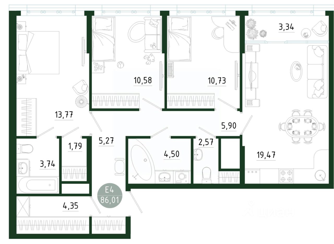 Продаётся 3-комнатная квартира в строящемся доме (Позиция 2), срок сдачи: III-кв. 2029, общей площадью 85.59 кв.м., на 7 этаже. Новый жилой комплекс в г. Тула "Платон Парк" от застройщика ООО "СЗ "МОНОЛИТ""