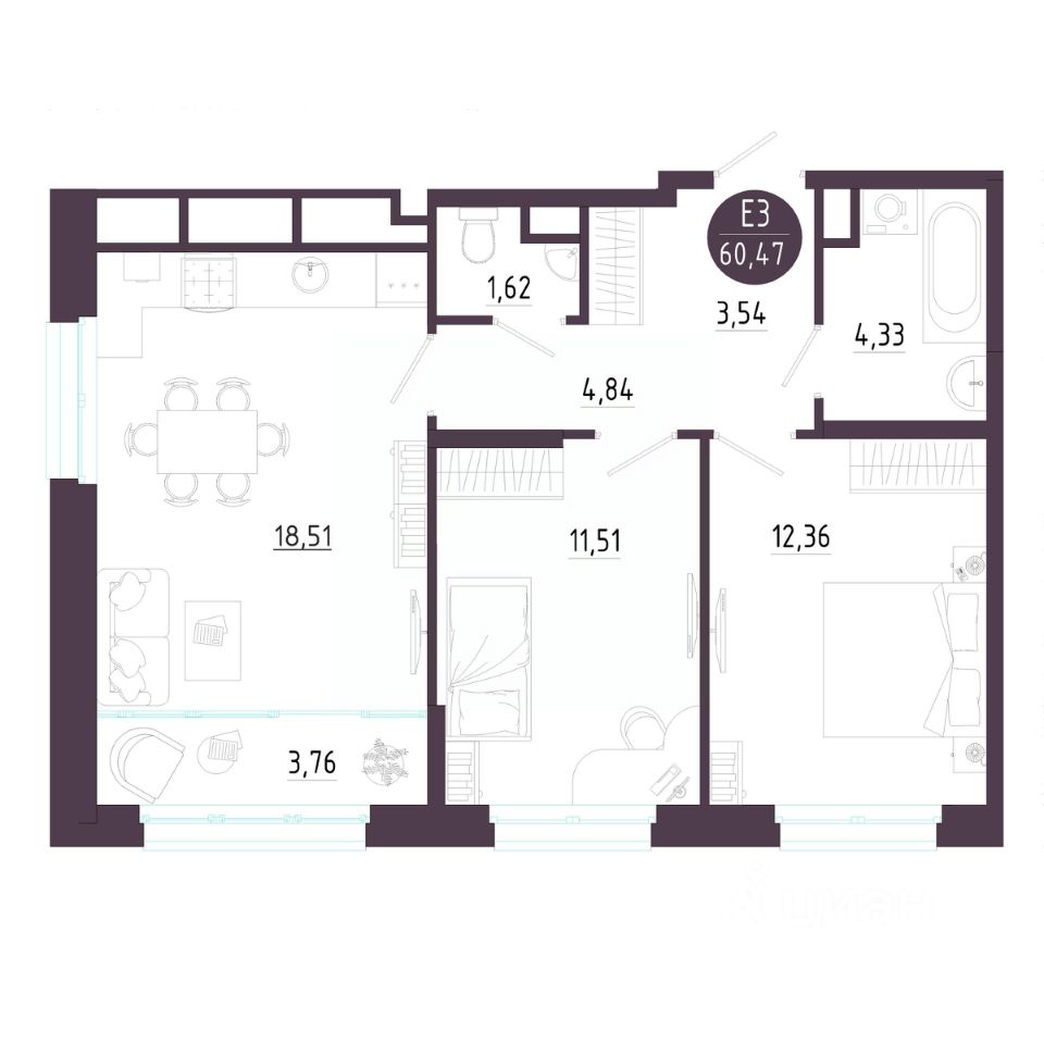 Общая площадь60,47 м²