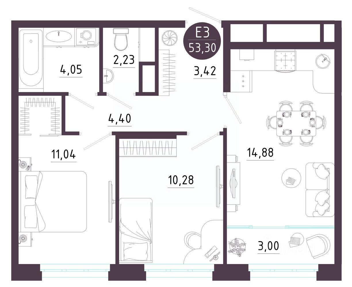 Общая площадь53,3 м²