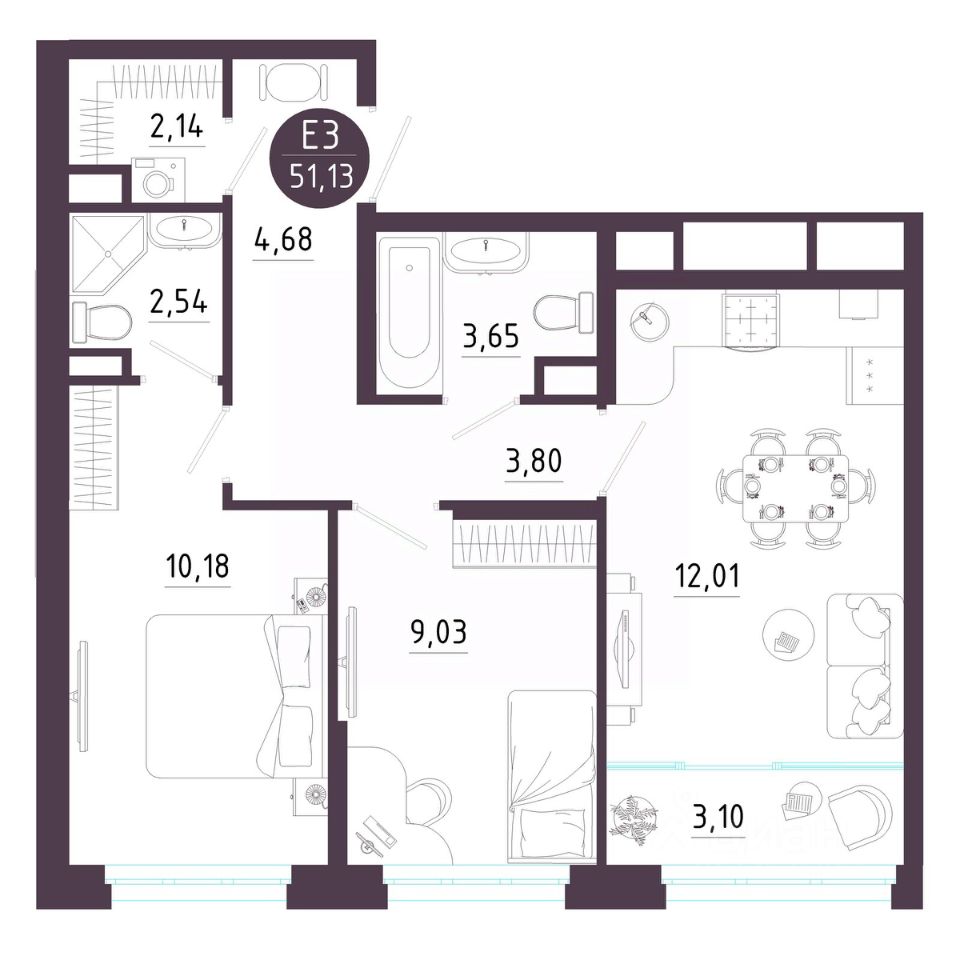Общая площадь51,13 м²