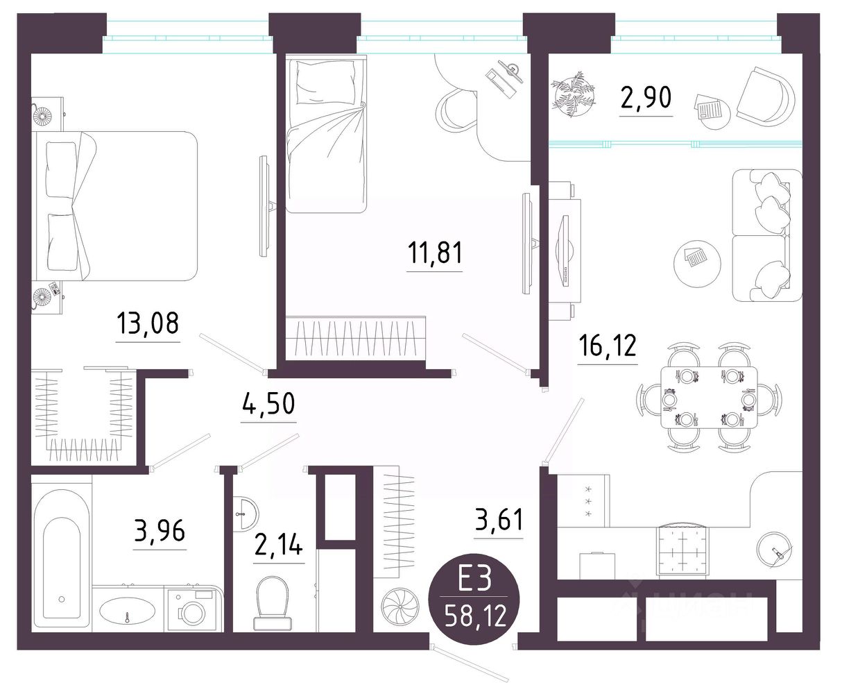 Общая площадь58,12 м²