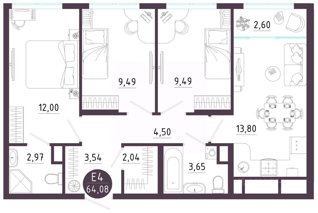 Общая площадь64,08 м²