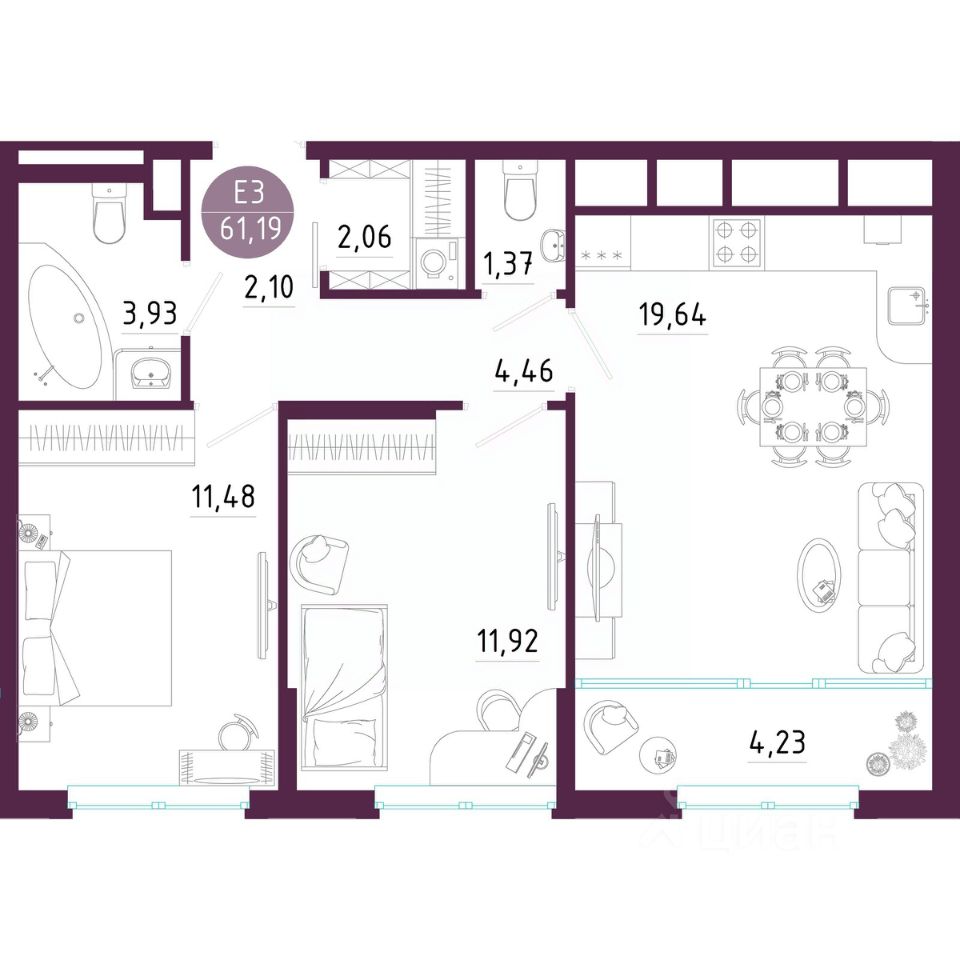 Общая площадь61,19 м²