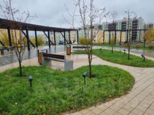 большим количеством детских современных площадок , спортивных площадок, где летом можно поиграть в футбол, а зимой покататься на коньках, шсть школа и детсад, амбулатория, современный сквер.