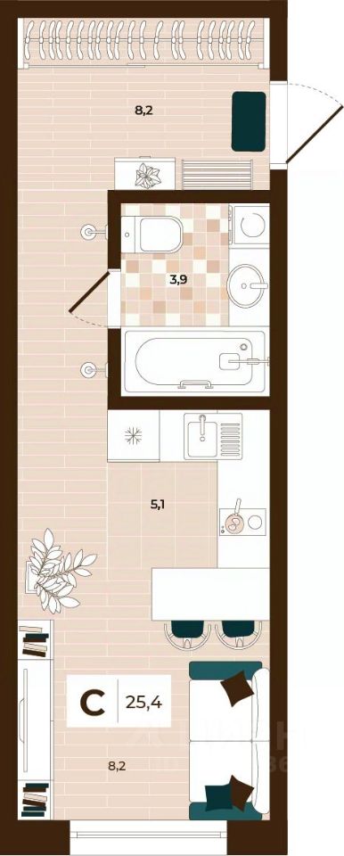 Продаётся студия в строящемся доме (Дом 28), срок сдачи: I-кв. 2027, общей площадью 25.4 кв.м., на 5 этаже. Расположение, транспортная доступность Новый жилой комплекс "Юго-Восточный" строится в Туле, в 3,5 км от центра города. Благодаря удачным транспортным развязкам, автолюбители смогут доехать до центральных кварталов примерно за 5 10 минут, составив наиболее быстрый и удобный маршрут с учетом загруженности дорог. Проблем с мобильностью не возникнет и у пассажиров общественного транспорта. Рядом с домом расположены остановки автобусов и маршрутных такси, которые быстро довезут до любого района города. Так, чтобы добраться до центра, следует дойти пешком до остановки "Медтехника", где останавливается маршрутное такси, доезжающее до центральных кварталов всего за 7 8 минут. Инфраструктура Район, где возводится новый жилой комплекс, активно застраивается, и сеть инфраструктуры сов временем будет расширяться. Но и сейчас все, что нужно для комфортной жизни в городе, находится недалеко от жилого комплекса. В шаговой доступности расположены продуктовые магазины: "Виктория", "Овощи-фрукты", Магазин рыбы и мяса птицы, магазин мяса и колбас "У Максима", супермаркеты "Дикси", "Пятерочка", "SPAR". Неподалеку находится гипермаркет "Линия", крупный торговый центр, в котором расположены отделения банков, гипермаркет "Глобус", салон оптики, мебельный магазин "Столплит", зоомагазин "Четыре лапы" и пр. В соседнем здании находится строительный гипермаркет "Леруа Мерлен", за ним крупный магазин товаров для спорта, туризма и активного отдыха "Декатлон".Недалеко от жилого комплекса открыты кафе и рестораны: кофейня "Bonape", пиццерия "Культура", кафе "Вкуснов", кафе быстрого обслуживания "Rapido", ресторан "У фонтана" и пр.В районе есть аптеки, поликлиники, диагностические центры. В шаговой доступности от жилого комплекса расположено несколько детских садиков, в том числе, садик комбинированного вида "Алые паруса". Есть дошкольные отделения, входящие в состав образовательных центров, Центры развития ребенка. Поблизости расположены средние школы, в том числе, школа для детей с ОВЗ. Рядом с жилым комплексом находится Тульская Духовная Семинария и Суворовское училище. Надежность застройщик: достраивает объект ООО Ин-Групп.АрхитектураЖилой комплекс будет представлен 19 монолитно-кирпичными корпусами переменной этажности, выполненными в едином архитектурном стиле. При строительстве ЖК "Юго-Восточный" применяются современные материалы высокого качества, которые обеспечивают надежность домов и комфортный микроклимат в помещениях. Каждая секция оснащается современными лифтами. Помещения общего пользования отделываются экологичными материалами. Квартиры предлагаются однокомнатные (от 43,9 кв. м), двухкомнатные (от 45,8 кв. м), трехкомнатные (от 60,4 кв. м) и четырехкомнатные (от 87,2 кв. м), а также уютные студии (от 28,9 кв. м).На внутренней территории проводится комплексное благоустройство: озеленение, организация игровых площадок, мест для отдыха и занятий спортом, п