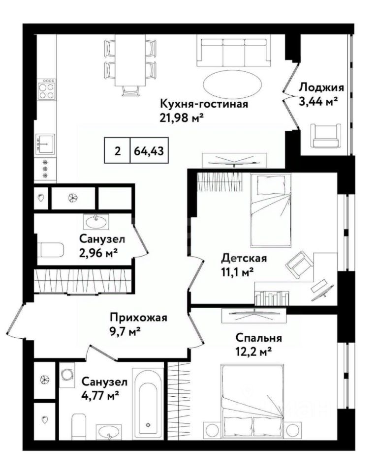 Вот оно идеальное пространство для жизни! Уютная и продуманная планировка: просторная кухня-гостиная, две отдельные спальни, две ванные комнаты, стильная лоджия и удобная прихожая с местом для хранения.