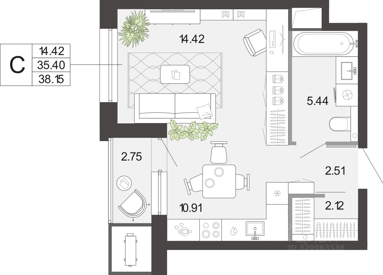 Общая площадь38,15 м²