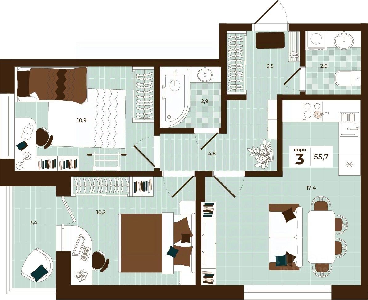 Продаётся 3-комнатная квартира в строящемся доме (Дом 28), срок сдачи: I-кв. 2027, общей площадью 55.7 кв.м., на 4 этаже. Расположение, транспортная доступность Новый жилой комплекс "Юго-Восточный" строится в Туле, в 3,5 км от центра города. Благодаря удачным транспортным развязкам, автолюбители смогут доехать до центральных кварталов примерно за 5 10 минут, составив наиболее быстрый и удобный маршрут с учетом загруженности дорог. Проблем с мобильностью не возникнет и у пассажиров общественного транспорта. Рядом с домом расположены остановки автобусов и маршрутных такси, которые быстро довезут до любого района города. Так, чтобы добраться до центра, следует дойти пешком до остановки "Медтехника", где останавливается маршрутное такси, доезжающее до центральных кварталов всего за 7 8 минут. Инфраструктура Район, где возводится новый жилой комплекс, активно застраивается, и сеть инфраструктуры сов временем будет расширяться. Но и сейчас все, что нужно для комфортной жизни в городе, находится недалеко от жилого комплекса. В шаговой доступности расположены продуктовые магазины: "Виктория", "Овощи-фрукты", Магазин рыбы и мяса птицы, магазин мяса и колбас "У Максима", супермаркеты "Дикси", "Пятерочка", "SPAR". Неподалеку находится гипермаркет "Линия", крупный торговый центр, в котором расположены отделения банков, гипермаркет "Глобус", салон оптики, мебельный магазин "Столплит", зоомагазин "Четыре лапы" и пр. В соседнем здании находится строительный гипермаркет "Леруа Мерлен", за ним крупный магазин товаров для спорта, туризма и активного отдыха "Декатлон".Недалеко от жилого комплекса открыты кафе и рестораны: кофейня "Bonape", пиццерия "Культура", кафе "Вкуснов", кафе быстрого обслуживания "Rapido", ресторан "У фонтана" и пр.В районе есть аптеки, поликлиники, диагностические центры. В шаговой доступности от жилого комплекса расположено несколько детских садиков, в том числе, садик комбинированного вида "Алые паруса". Есть дошкольные отделения, входящие в состав образовательных центров, Центры развития ребенка. Поблизости расположены средние школы, в том числе, школа для детей с ОВЗ. Рядом с жилым комплексом находится Тульская Духовная Семинария и Суворовское училище. Надежность застройщик: достраивает объект ООО Ин-Групп.АрхитектураЖилой комплекс будет представлен 19 монолитно-кирпичными корпусами переменной этажности, выполненными в едином архитектурном стиле. При строительстве ЖК "Юго-Восточный" применяются современные материалы высокого качества, которые обеспечивают надежность домов и комфортный микроклимат в помещениях. Каждая секция оснащается современными лифтами. Помещения общего пользования отделываются экологичными материалами. Квартиры предлагаются однокомнатные (от 43,9 кв. м), двухкомнатные (от 45,8 кв. м), трехкомнатные (от 60,4 кв. м) и четырехкомнатные (от 87,2 кв. м), а также уютные студии (от 28,9 кв. м).На внутренней территории проводится комплексное благоустройство: озеленение, организация игровых площадок, мест для отдыха и заня