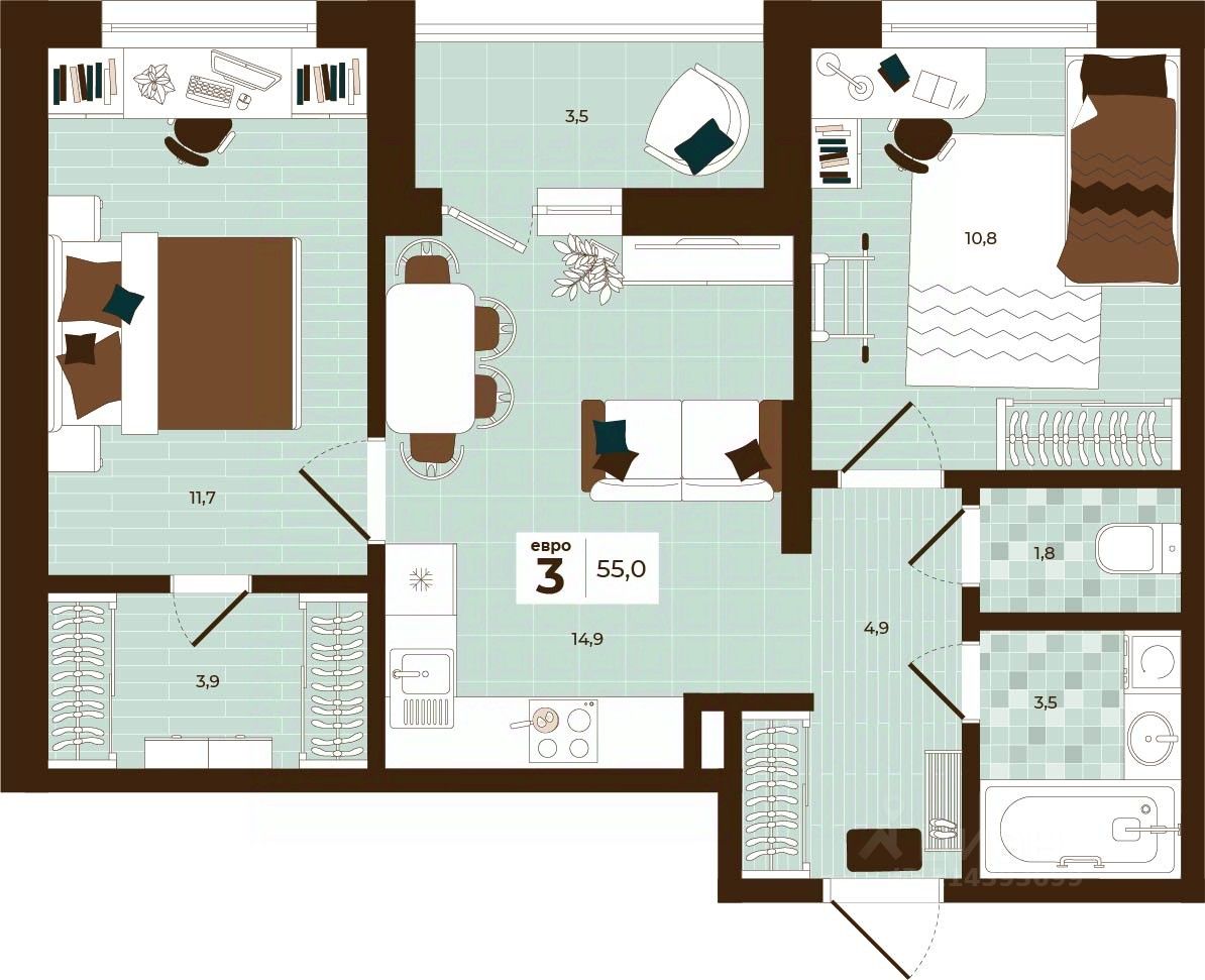Продаётся 3-комнатная квартира в строящемся доме (Дом 28), срок сдачи: I-кв. 2027, общей площадью 55 кв.м., на 11 этаже. Расположение, транспортная доступность Новый жилой комплекс "Юго-Восточный" строится в Туле, в 3,5 км от центра города. Благодаря удачным транспортным развязкам, автолюбители смогут доехать до центральных кварталов примерно за 5 10 минут, составив наиболее быстрый и удобный маршрут с учетом загруженности дорог. Проблем с мобильностью не возникнет и у пассажиров общественного транспорта. Рядом с домом расположены остановки автобусов и маршрутных такси, которые быстро довезут до любого района города. Так, чтобы добраться до центра, следует дойти пешком до остановки "Медтехника", где останавливается маршрутное такси, доезжающее до центральных кварталов всего за 7 8 минут. Инфраструктура Район, где возводится новый жилой комплекс, активно застраивается, и сеть инфраструктуры сов временем будет расширяться. Но и сейчас все, что нужно для комфортной жизни в городе, находится недалеко от жилого комплекса. В шаговой доступности расположены продуктовые магазины: "Виктория", "Овощи-фрукты", Магазин рыбы и мяса птицы, магазин мяса и колбас "У Максима", супермаркеты "Дикси", "Пятерочка", "SPAR". Неподалеку находится гипермаркет "Линия", крупный торговый центр, в котором расположены отделения банков, гипермаркет "Глобус", салон оптики, мебельный магазин "Столплит", зоомагазин "Четыре лапы" и пр. В соседнем здании находится строительный гипермаркет "Леруа Мерлен", за ним крупный магазин товаров для спорта, туризма и активного отдыха "Декатлон".Недалеко от жилого комплекса открыты кафе и рестораны: кофейня "Bonape", пиццерия "Культура", кафе "Вкуснов", кафе быстрого обслуживания "Rapido", ресторан "У фонтана" и пр.В районе есть аптеки, поликлиники, диагностические центры. В шаговой доступности от жилого комплекса расположено несколько детских садиков, в том числе, садик комбинированного вида "Алые паруса". Есть дошкольные отделения, входящие в состав образовательных центров, Центры развития ребенка. Поблизости расположены средние школы, в том числе, школа для детей с ОВЗ. Рядом с жилым комплексом находится Тульская Духовная Семинария и Суворовское училище. Надежность застройщик: достраивает объект ООО Ин-Групп.АрхитектураЖилой комплекс будет представлен 19 монолитно-кирпичными корпусами переменной этажности, выполненными в едином архитектурном стиле. При строительстве ЖК "Юго-Восточный" применяются современные материалы высокого качества, которые обеспечивают надежность домов и комфортный микроклимат в помещениях. Каждая секция оснащается современными лифтами. Помещения общего пользования отделываются экологичными материалами. Квартиры предлагаются однокомнатные (от 43,9 кв. м), двухкомнатные (от 45,8 кв. м), трехкомнатные (от 60,4 кв. м) и четырехкомнатные (от 87,2 кв. м), а также уютные студии (от 28,9 кв. м).На внутренней территории проводится комплексное благоустройство: озеленение, организация игровых площадок, мест для отдыха и занят
