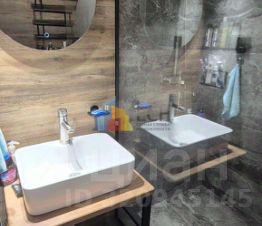 В санузле широкоформатный керамогранит, современная душевая, установлены фильтры для воды, теплый пол, инсталяция Grohe.
