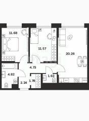 Огромная кухня-гостиная 20,26 квадратов, 2 изолированные спальни, 2 сан узла, своя гардеробная. 8 этаж в доме номер 2. Сдача - к2 квартал 26 года.