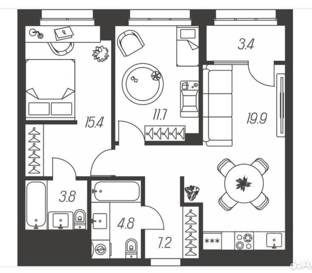 Современная планировка, кухня-гостиная 19.9 кВ.метра, 2 санузла, 2 раздельные комнаты позволят насладиться пространством.