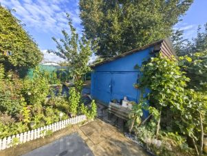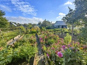 Небольшой ухоженный участок земли перед домом, есть теплица, гараж под садовый инвентарь и технику, игровая зона с садовыми качелями.