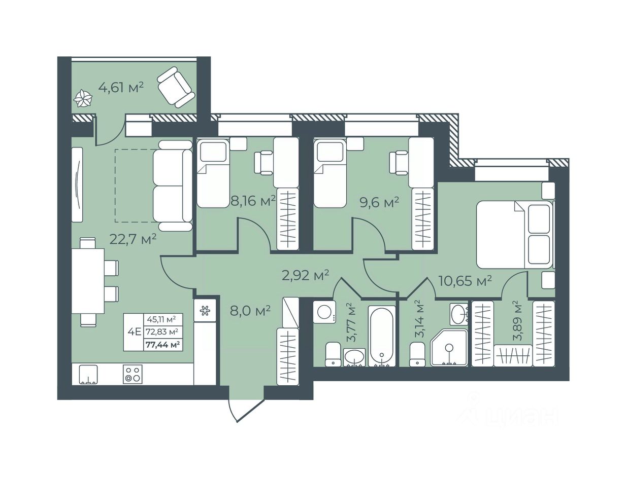 Общая площадь77,44 м²