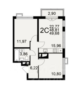 Общая площадь — 48.81 кв. м, из которых 22,7 м2, составляет жилая площадь, а просторная кухня занимает 15,96 м2.