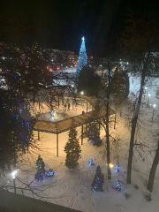 За домом городская площадь с новой зоной отдыха поющим фонтаном и хорошей современной детскостей площадкой.
