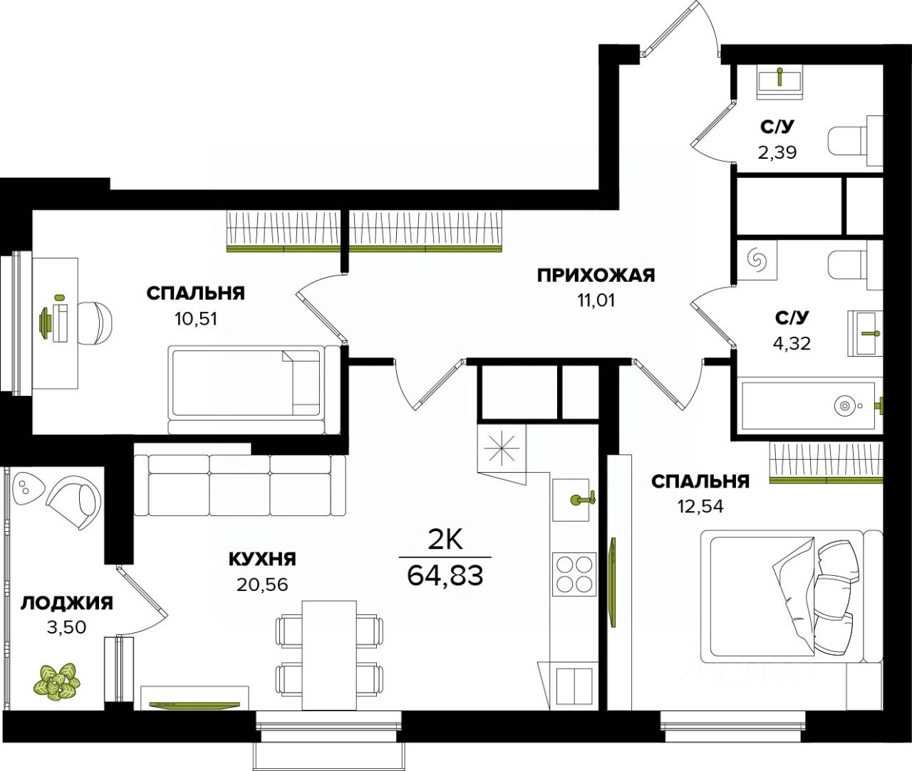 Общая площадь64,83 м²