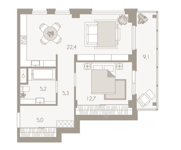 Удобная планировка: большая, наполненная светом кухня-гостиная 22,4 кв.м, изолированная спальня с выходом на панорамную лоджию.