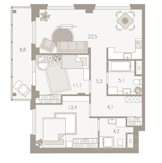 Удобная планировка: большая, наполненная светом кухня-гостиная 22,5 кв.м, две изолированные спальни (13,4 и 11,1), одна из которых мастер спальня и панорамная лоджия.
