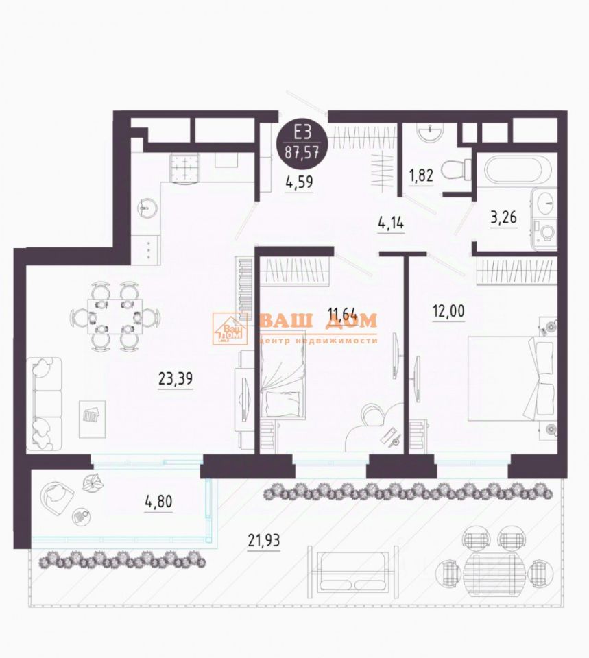 Арт. 119802859 Продается ОТ ЗАСТРОЙЩИКА большая ЕВРО 3. 69,87 кв м с собственной террассой на 1 этаже дома "Ванильный" в ЖК "Пряничная Слобода".