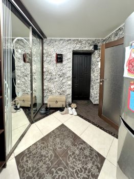 Стильный и качественный ремонт с использованием дорогих материалов. Встроенная кухня с холодильником и духовкой, столешница из искусственного камня. На полу в коридоре и кухне кафель.