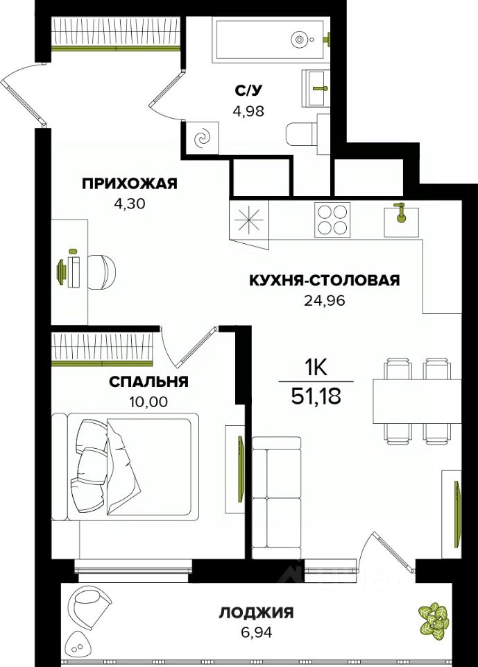 Общая площадь51,18 м²