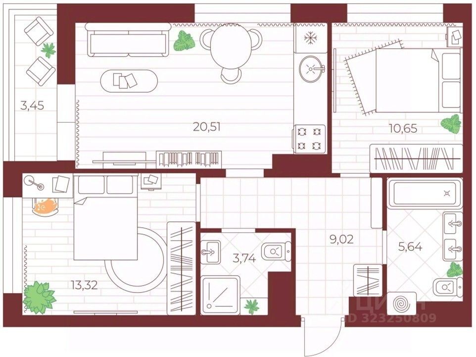 Евротрешка 61.6 кв.м. с большой кухней-гостиной с двумя спальнями 13 и 10 кв.м. Раздельный санузел, причем один из санузлов можно сделать совмещенным, а второй переоборудовать под кладовку/гардеробную. Панорамный балкон с выходом из гостиной. Удобной просторная прихожая с отделенной "грязной зоной". Спальни разделены кухней-гостиной и коридором, что очень удобно. Санузел возле каждой из спален. Продуманная смарт-планировка для комфортного проживания. Высокий, но не крайний этаж с прекрасными видами. Корзина для кондиционера.