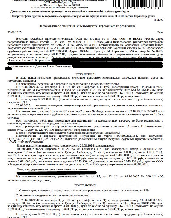 Помещение, назначение: жилое, наименование: 1-комнатная квартира, площадь 31,3 кв.м, кадастровый номер 71:30:040102:182, местоположение: Тульская область, г. Тула, ул. Сойфера, д. 29, кв. 9. Вид ограничений (обременений): арест на основании Определения Советского районного суда г. Тулы от 24.05.2024 г. Сведениями о зарегистрированных по данному адресу лицах, а также о задолженности по взносам на капитальный ремонт Организатор торгов не располагает. Взыскатель: Дьякова Е.В. Начальная цена: 3 078 530 (Три миллиона семьдесят восемь тысяч пятьсот тридцать) руб. 00 коп., без НДС. Задаток: 1 500 000 (Один миллион пятьсот тысяч) руб. 00 коп.; Шаг аукциона 1%: 30 785 (Тридцать тысяч семьсот восемьдесят пять) руб. 30 коп.