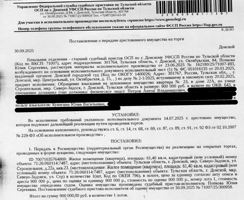 Помещение, назначение: жилое, наименование: 3-комнатная квартира, площадь 61,4 кв.м., кадастровый номер 71:26:060114:7487, местоположение: Тульская область, г Донской, мкр Северо-Задонск, ул Строительная, д 22а, кв. 23. Сведениями о зарегистрированных по данному адресу лицах, а также о задолженности по взносам на капитальный ремонт Организатор торгов не располагает. Залогодержатель: Кунегина (Трунова) Ю.В. Начальная цена: 900 000 (Девятьсот тысяч) руб. 00 коп., без НДС. Задаток: 40 000 (Сорок тысяч) руб. 00 коп. Шаг аукциона 1%: 9 000 (Девять тысяч) руб. 00 коп.
