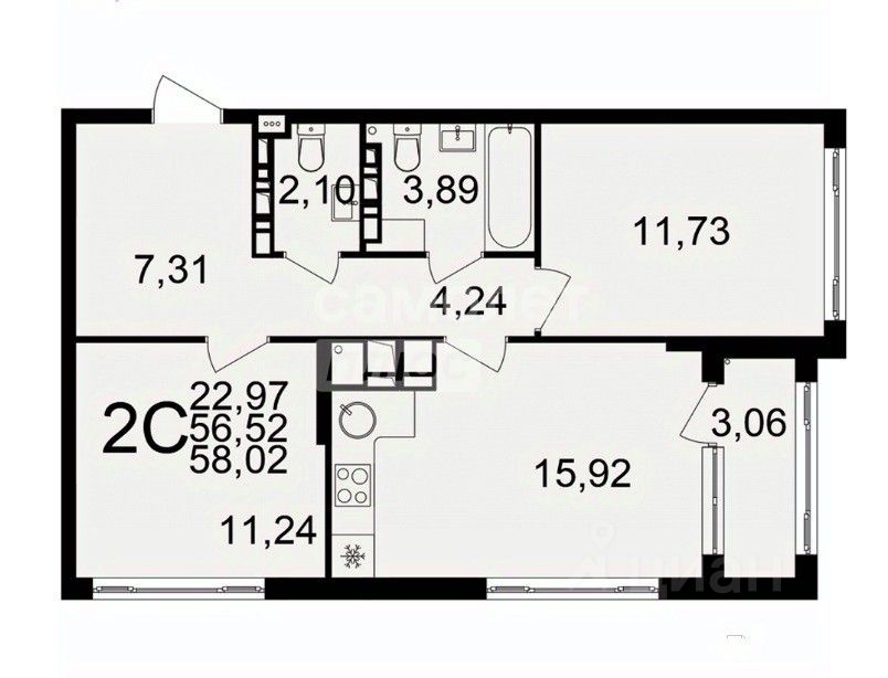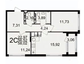 В продаже квартира Евро-3, 58 кв. м. Сдача дома в 2027 г.