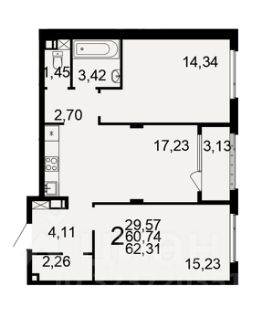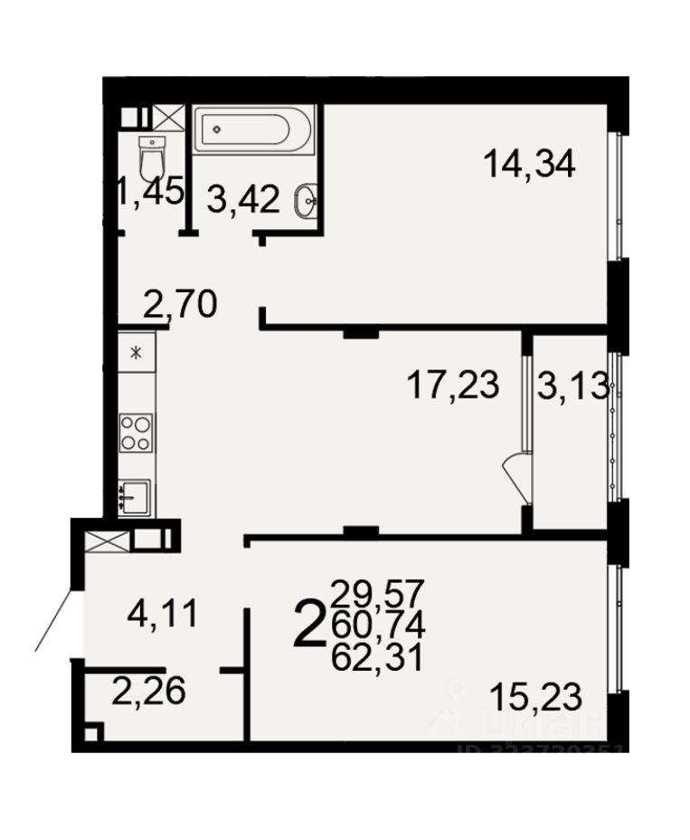 Общая площадь — 62,31кв. м, из которых 29,57 м2, составляет жилая площадь, а просторная кухня занимает 17,23 м2.