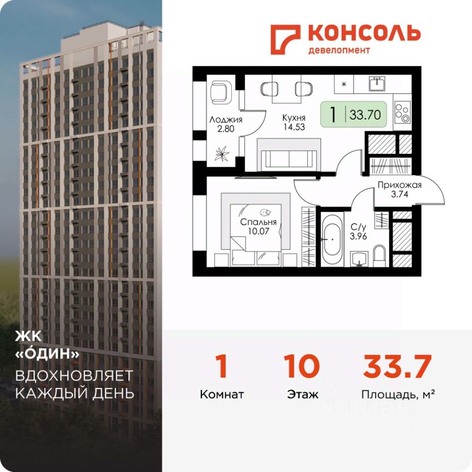 Продается однокомнатная квартира 104 без отделки в ЖК "ОДИН" от застройщика | Чистовая отделка | Семейная ипотека 3,5%