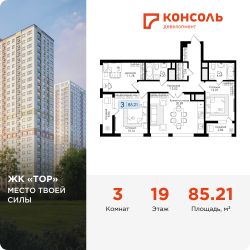Продается трехкомнатная квартира 177 с чистовой отделкой в ЖК "ТОР" площадью 85.21 на 19 этаже от застройщика Консоль девелопмент. Жилому комплексу ТОР присвоен повышенный уровень комфортности — комфорт плюс. Он подразумевает светлые просторные квартиры с большими окнами и удобной планировкой, оригинальные парадные и общественные пространства.