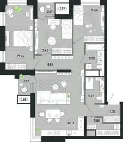 Продаётся 3-комнатная квартира в строящемся доме (Гелиос), срок сдачи: II-кв. 2029, общей площадью 110.77 кв.м., на 21 этаже. Новый жилой комплекс "ПРЕМЬЕР ПАРК" от застройщика "ПРЕМЬЕР ПАРК ТУЛА" расположен по адресу: г. Тула, район Советский, улица Ф. Энгельса, дом 70