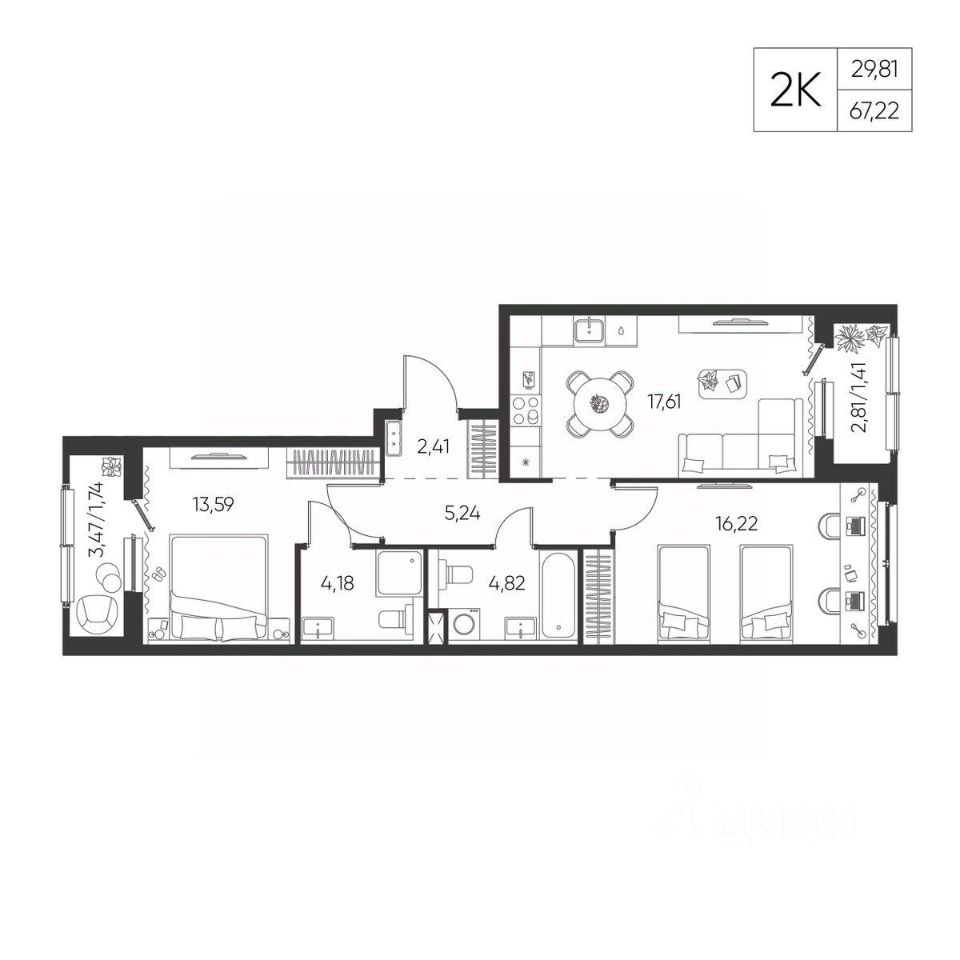 Общая площадь67,21 м²