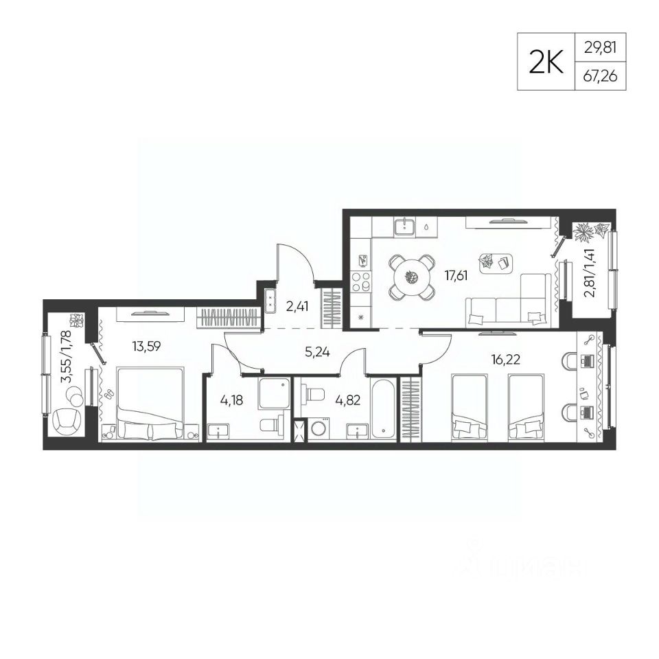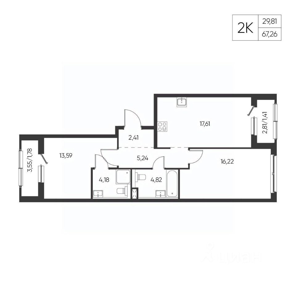 Комнаты и кухня: Ламинат, флизелиновые обои, натяжной потолок с выводом под люстру, розетки, выключатели, радиаторы с терморегуляторами, межкомнатные двери. Предустановленная трасса для блока сплит системы кондиционера. На кухне — подготовка для подсветки кухонного гарнитура, воды и канализации. Установлены розетки для холодильника, посудомоечной машины, вытяжки и варочной панели, предусмотрены розетки в зоне фартука.