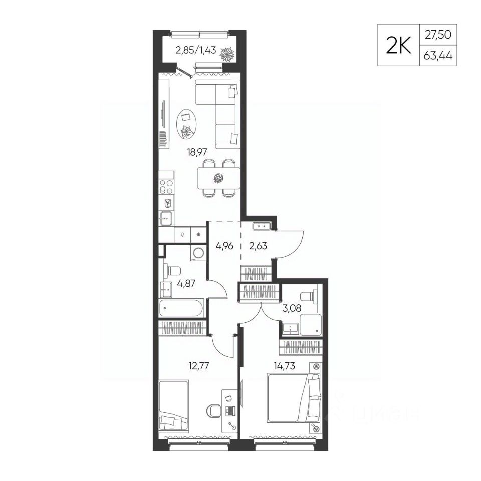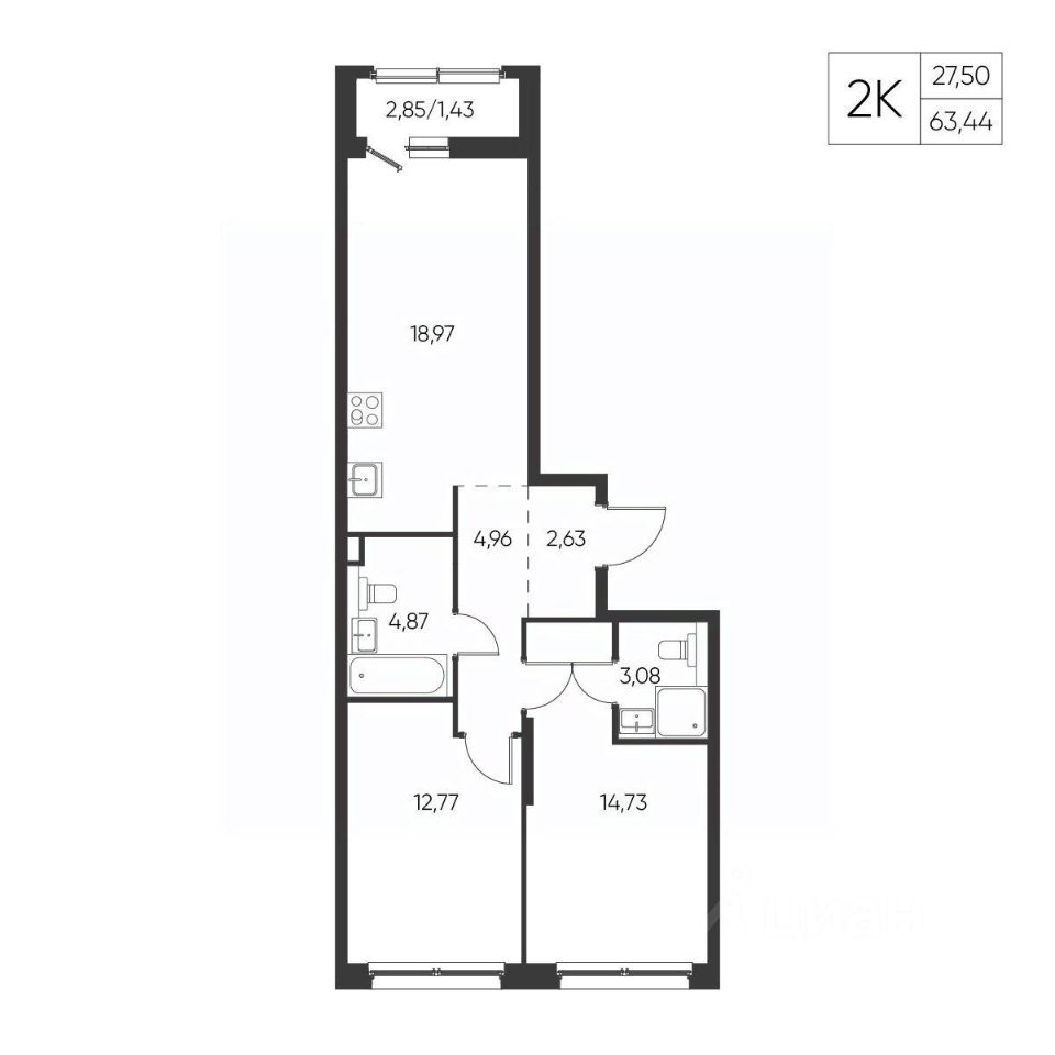 Общая площадь63,44 м²