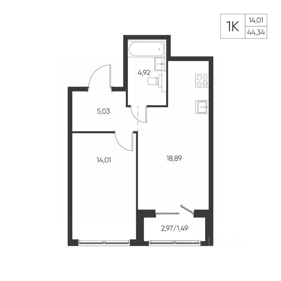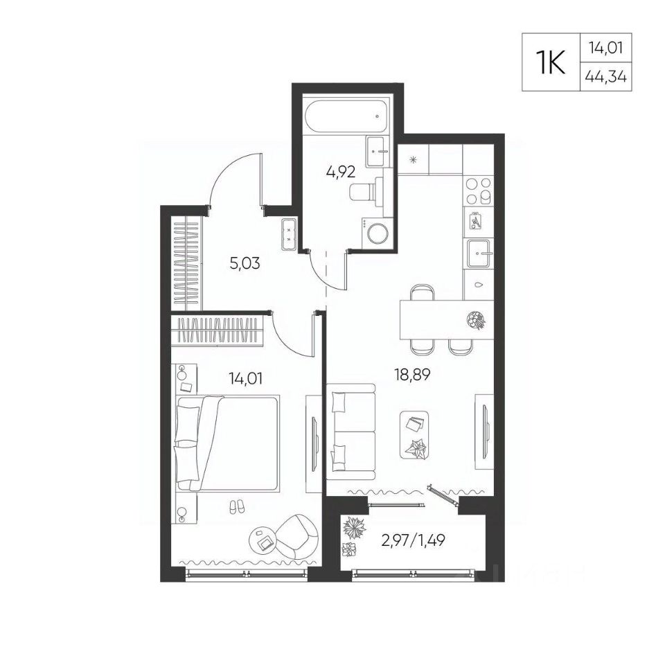 Общая площадь44,34 м²